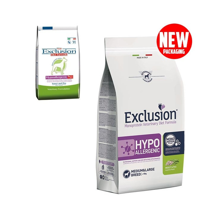 Exclusion Diet Hypoallergenic Insect and Pea (Insekten und Erbsen) ist ein diätetisches Alleinfutter für ausgewachsene Hunde, das zur Reduzierung von Unverträglichkeiten gegenüber Inhaltsstoffen und Nährstoffen entwickelt wurde.