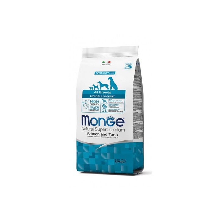 Monge Natural Superpremium Specialty Line Hypoallergene Kroketten mit Lachs und Thunfisch sind ein ausgewogenes Alleinfutter für ausgewachsene Hunde aller Rassen, die eine hochverdauliche Nahrung benötigen und Nahrungsmittelunverträglichkeiten vorbeugen.