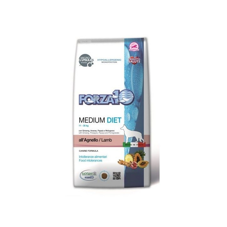 Forza10 Medium Diät mit Lammist die Referenz der diätetischen Linie von SANYpet, um alle Hunde zufrieden zu stellen, die an einer Überempfindlichkeit gegen bestimmte Fleischsorten aus intensiver Landwirtschaft leiden.