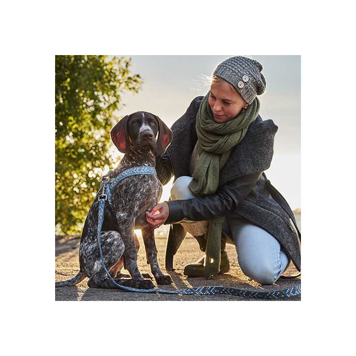 Die Standardleine ist mit einem Doppelgriff ausgestattet, der über dem Karabiner angebracht ist, um den Hund bei Bedarf auf nur 30 oder 50 cm zu halten. Seine Polsterung ist 100% ECO. Die Schlaufe ist aus Stahl. Sein Reflektor ist abnehmbar und repositionierbar. Es ist in Stärken ab 15 mm für Hunde bis 25 kg und ab 25 mm für Hunde bis 45 kg erhältlich. Die Standardleine Razzle Dazzle ist in allen vier Geschirrfarben erhältlich.