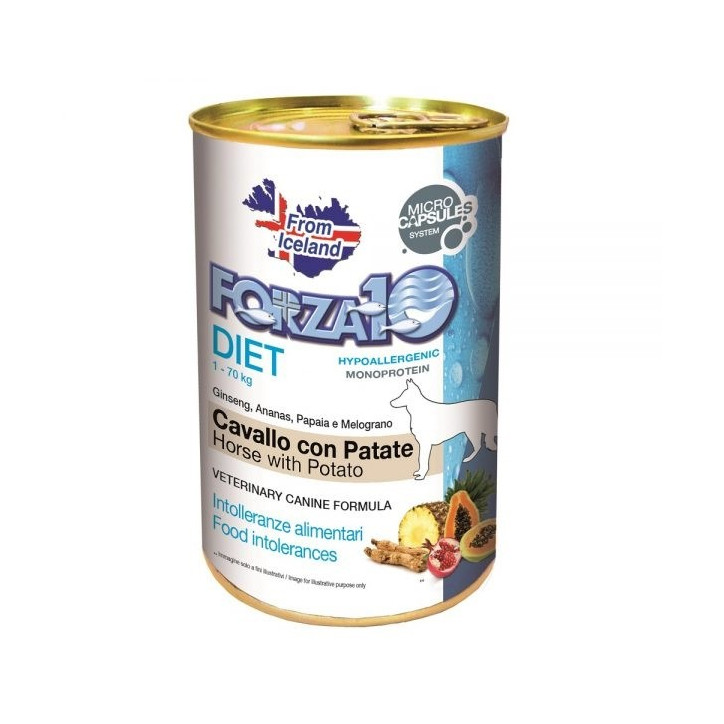 FORZA10Diätpferd mit Kartoffelnist eine monoproteinische Diät mit alternativem Fleisch der von SANY . untersuchten DiätlinieHaustierintegriert mit innovativen Mikrokapseln, indiziert zur Reduzierung von Nahrungsmittelunverträglichkeiten.