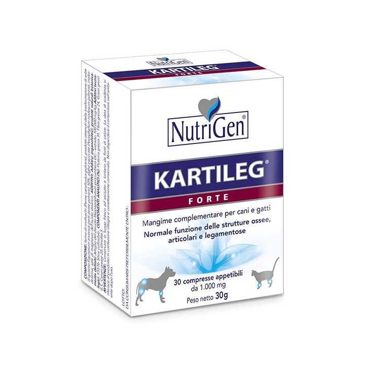 ANWENDUNGSGEBIETE: KARTILEG FORTE ist ein Ergänzungsfutter für Hunde und Katzen in schmackhaften Tabletten, das zur Förderung des normalen Wohlbefindens und der normalen Funktion von Knochen-, Gelenk- und Bänderstrukturen geeignet ist.