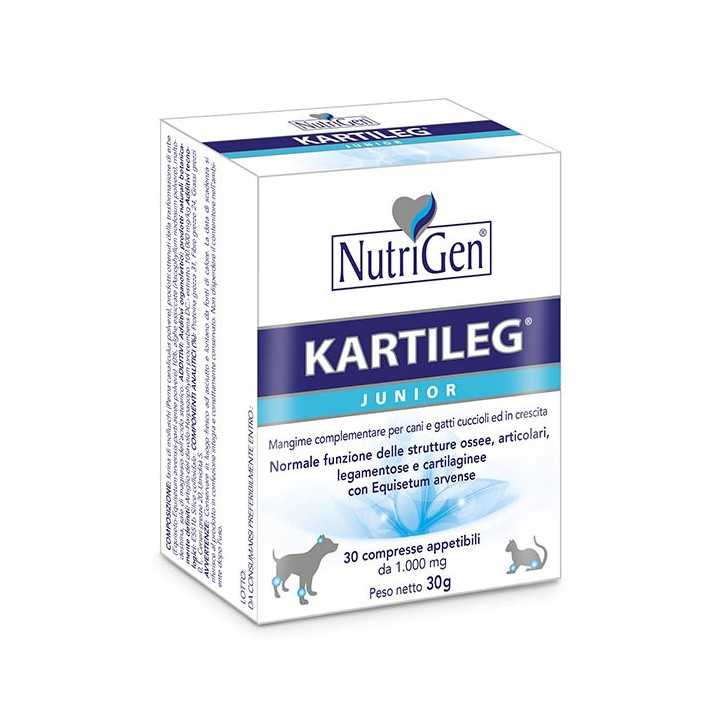 ANWENDUNGSGEBIETE: KARTILEG JUNIOR ist ein Ergänzungsfutter für Hunde und Katzen, Welpen und im Wachstum, formuliert in schmackhaften Tabletten mit Schachtelhalm, einer natürlichen Mineralstoffquelle, die zur Förderung der normalen Funktion von Knochen-, Gelenk-, Bänder- und Knorpelstrukturen nützlich ist.