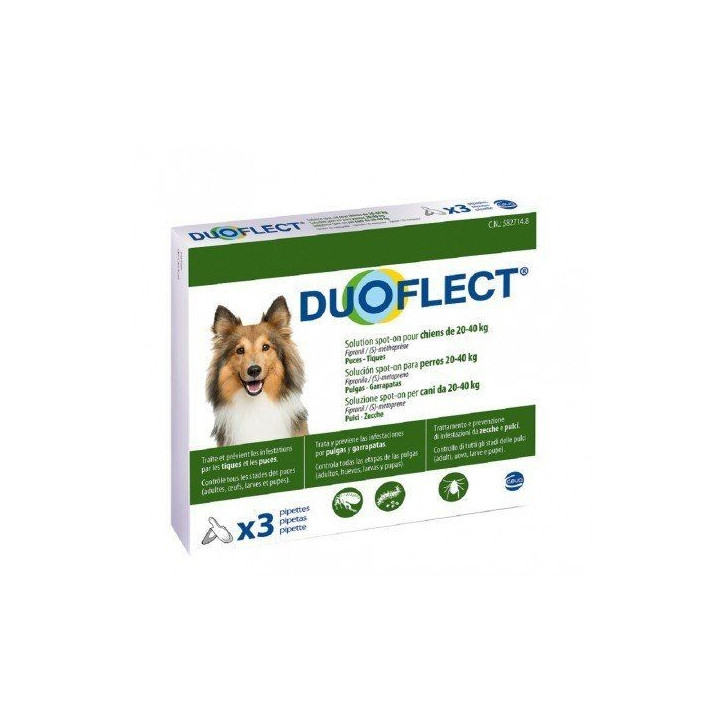 Duoflect ist Cevas Antiparasitenmittel gegen Flöhe und Zecken, zum Auftragen in 3 praktischen Pipetten für Hunde von 20 bis 40 kg mit 2,82 ml Produkt pro Pipette.