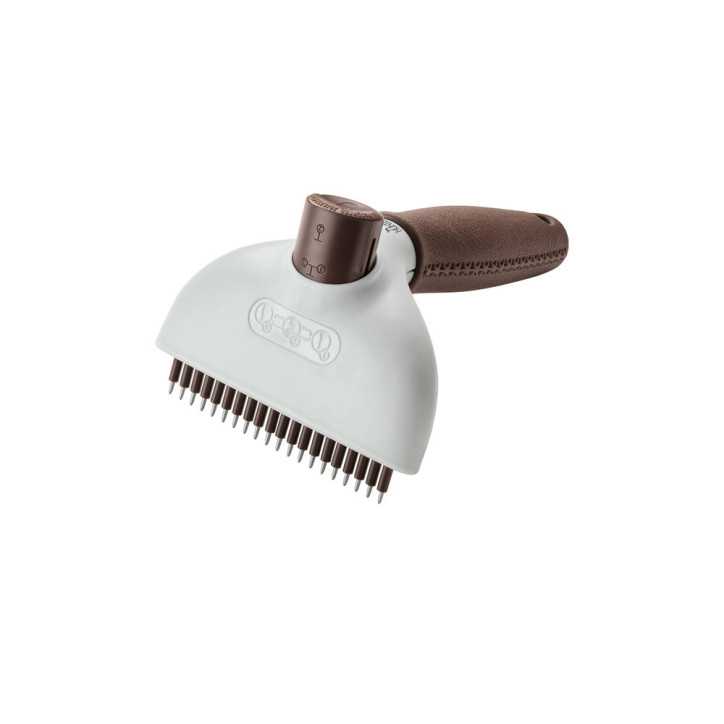 Selbstreinigender Entwirrrechen zum Entfernen von abgestorbenen Schuppen und Schuppen von Deck- und Unterwolle.