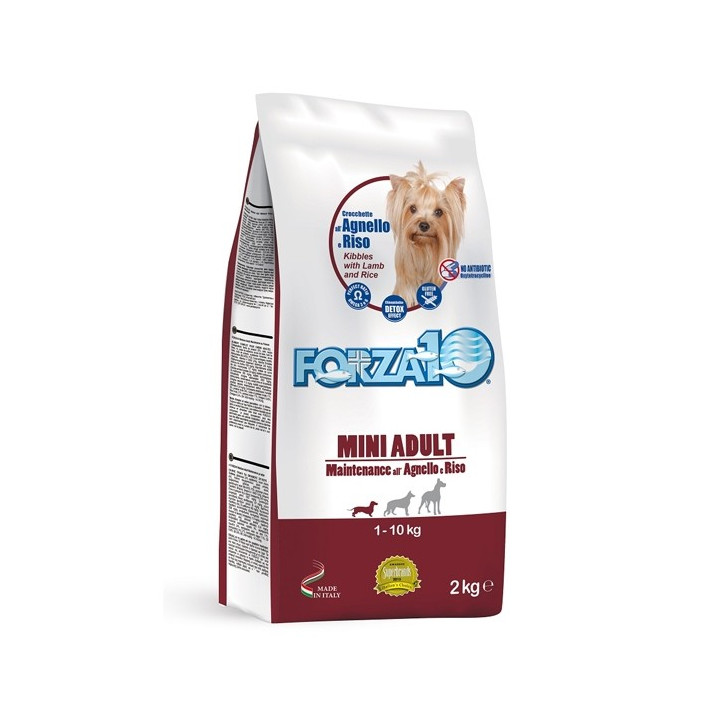 FORZA10 Mini Adult Maintenance mit Lamm und Reis ist ein spezielles Erhaltungsfutter für kleine ausgewachsene Hunde, vollständig und ausgewogen, formuliert von der SANY-Forschungs- und Entwicklungsabteilung für Haustiere.
