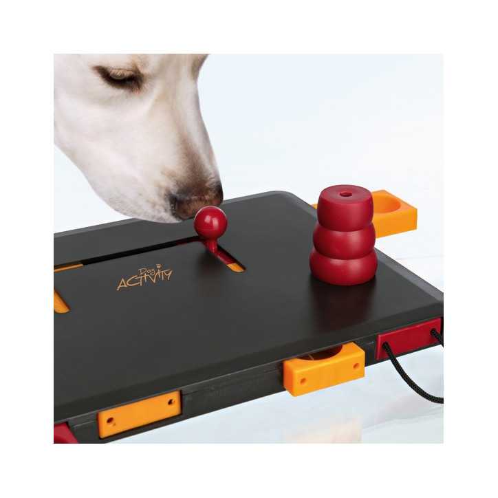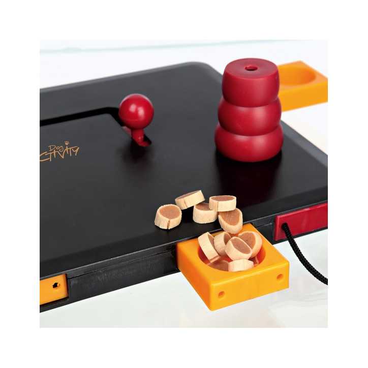 Strategisches Spiel für Profis: Der Hund muss den Knauf mit geschickten Bewegungen in verschiedene Richtungen bewegen, um die 4 Fächer mit den Leckerlis herauszuziehen.