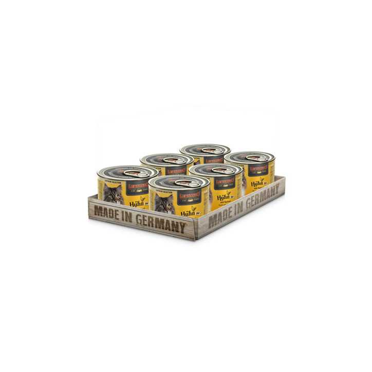 Zusammensetzung: Hühnerfleisch, -herz, -leber und -magen (66 %); Hühnerbrühe (28,0 %); Spinat (4 %); Mineralien (0,5 %); getrocknete Eierschalen (0,5 %); Lachsöl (0,1 %); getrocknete Katzenminze (0,1 %)
