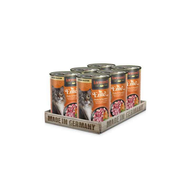 Zusammensetzung: Hühnerfleisch, -herz, -leber und -magen (40 %); Hühner- und Entenbrühe (28,8 %); Entenfleisch und -herzen (26 %); Karotten (4 %); Mineralien (0,5 %); getrocknete Eierschalen (0,5 %); Lachsöl (0,1 %); getrocknete Katzenminze (0,1 %)