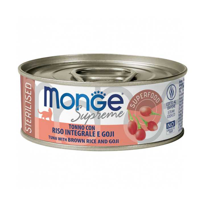 MONGE SUPREME sterilisierter Katzenthunfisch mit braunem Reis und Goji ist ein ausgewogenes Futter für sterilisierte erwachsene Katzen. lyOOuBJ^mb