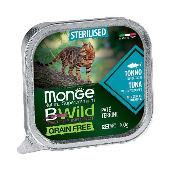 Monge Natural Super Premium Bwild Grain Free Formula Sterilized Cat Tuna with vegetables (green beans and carrots) is a complete and balanced food for sterilized adult cats.