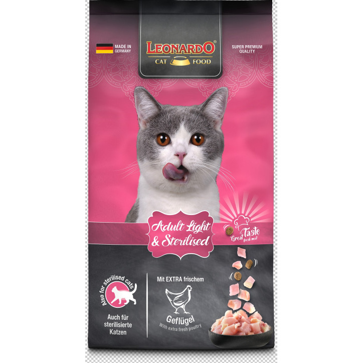 Leonardo Adult Light is ideal for all breeds of adult cats from one year of age , also recommended for less active and overweight cats.