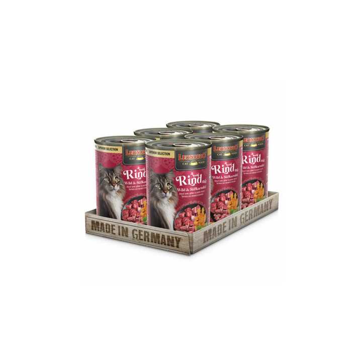 Composition: beef, heart, liver and lung (40%); beef and game broth (28.8%); game (deer, wild boar) (26%) sweet potato (4%); minerals (0.5%); dried eggshells (0.5%); salmon oil (0.1%); dried catnip (0.1%)