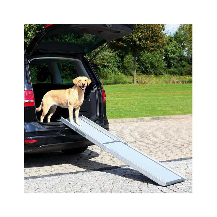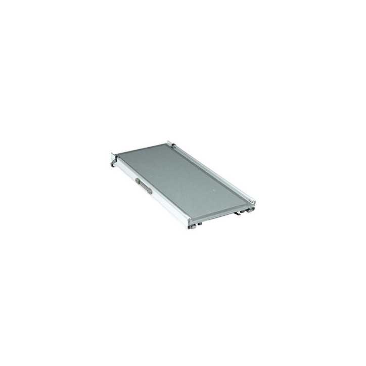 Telescopic aluminum / plastic ramp with non-slip coating and side safety rails.