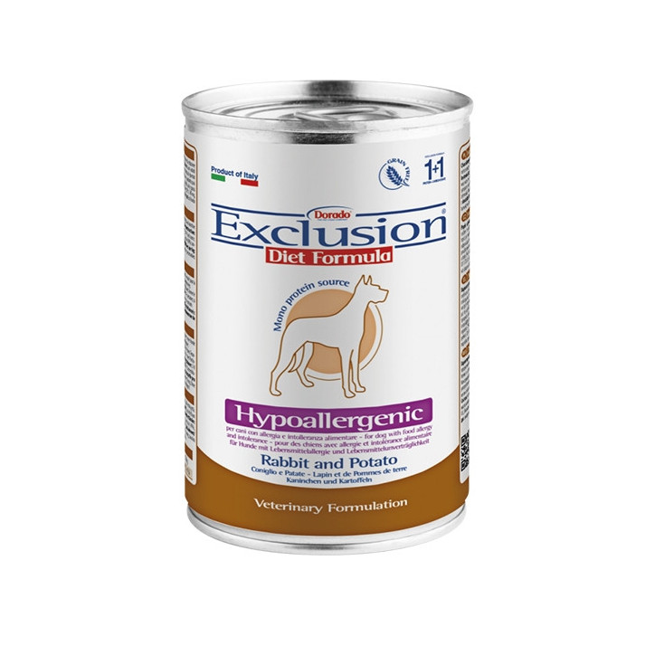 Exclusion Monoprotein Veterinary Formula Hypoallergenic is a complete line of dietetic foods with a monoprotein and mono carbohydrate formulation, made with alternative sources of protein, innovative ingredients, grain free and preserved with natural tocopherols; represents the nutritional response available to the veterinarian, differentiated by size and in the dry and wet version, specific for the treatment of food intolerances.