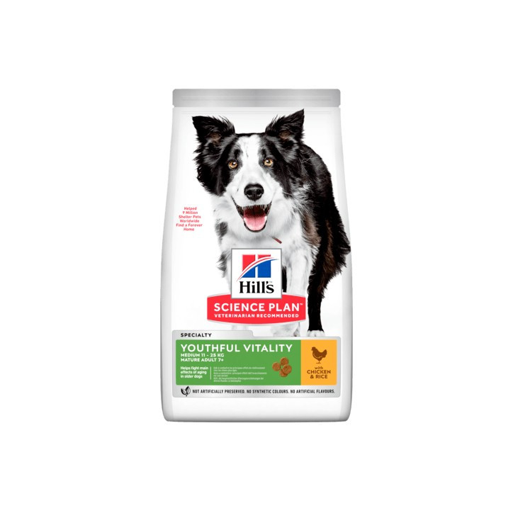 Hill's Science PlanYouthful VitalityAdult Dog Food with Chicken and Rice is scientifically developed to counteract the main effects of aging in older dogs.