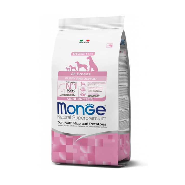 Monge Natural Superpremium All breeds Puppy and Junior Monoprotein* Pork with Rice and Potatoes is a complete food for puppies of all sizes.