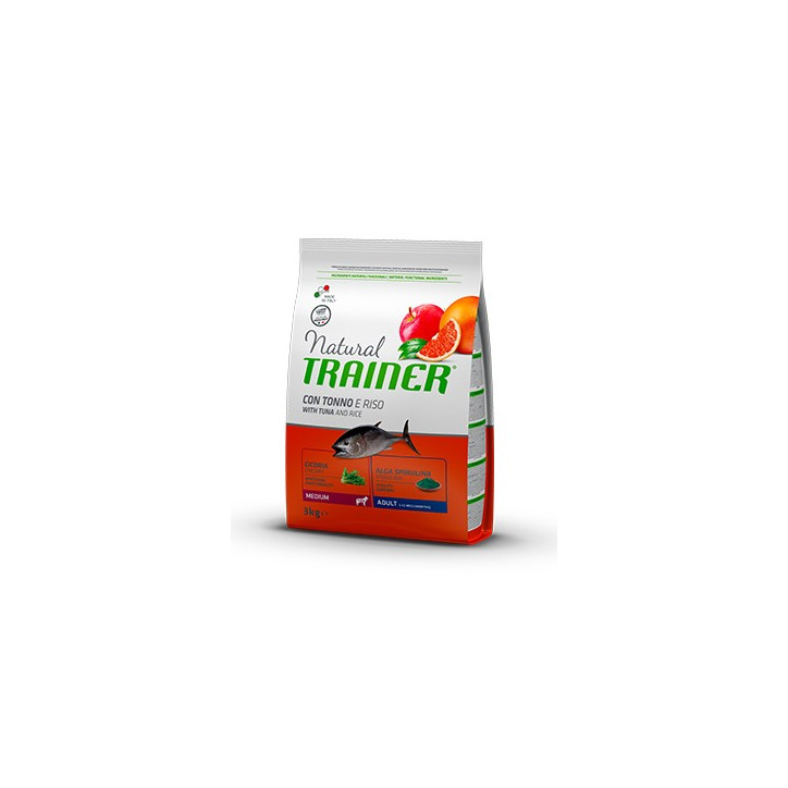 Natural Trainer Adult Medium adult dog food is made with a combination of tuna as a protein supply, along with chicory and spirulina algae as functional ingredients. A complete food that will give your medium-sized dog the energy it needs