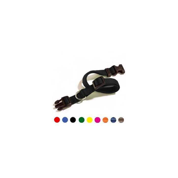 This classic Nylon collar is very resistant because it is made with high quality materials and with 2.8 mm thick nylon tape. It is equipped with an adjustable quick release and a double butterfly stitching which guarantees its safety. It does not discolour because it is yarn dyed.