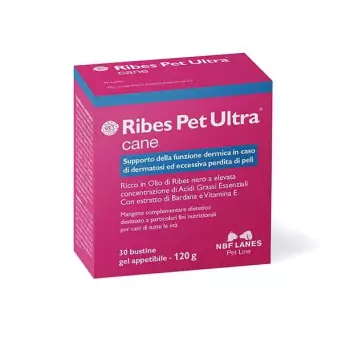 Ribes Pet Ultra in palatable gel is a dietary complementary feed intended for particular nutritional purposes for medium-large sized dogs, with a high concentration of essential fatty acids and with burdock extract and vitamin E, to support the dermal function in case of dermatosis and excessive hair loss.