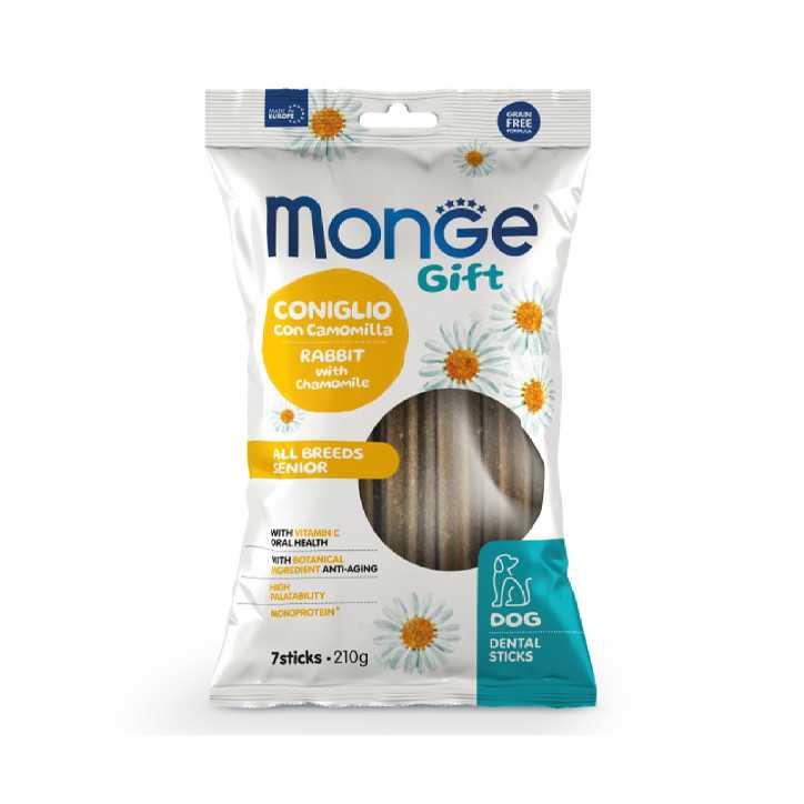 MONGE GIFT ALL BREEDS SENIOR DOG RABBIT WITH CHAMOMILE is a complementary food for senior dogs of all sizes. Specifically developed for the well-being of your dog thanks to the inclusion of vegetable fiber for greater texture elasticity and to aid chewing. Product formulated without cereals and with a single animal protein source*, rabbit, a precious source of highly digestible and biological value proteins. The formulation is enriched with vitamin C for the health of the oral cavity and is characterized by high palatability to stimulate the most difficult palates. The inclusion of botanical ingredients, such as chamomile with antioxidant properties, is the result of Made in Italy research to support the quality of life of our dogs. Without artificial colors and added sugars.