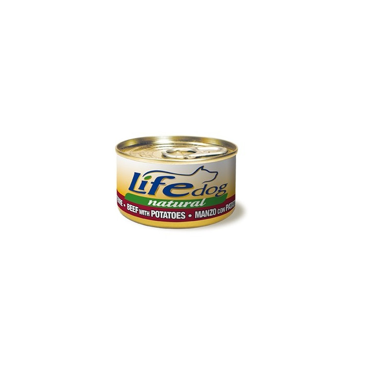 Dicedbeef pulpwithdiced potatoes, preserved invegetable sauce. It is a very tasty food, it can be offered to the dog alone or mixed with dry croquettes to make them more palatable. Beef isrich in proteinsof high biological value, minerals and vitamins. Potatoes have a good carbohydrate content. Without the addition of dyes, preservatives, cereals and additives.