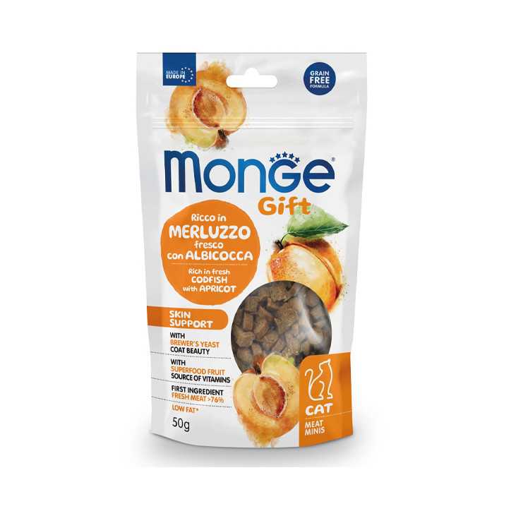 MONGE GIFT SKIN SUPPORT CAT RICH IN FRESH COD WITH APRICOT is a complementary food for adult cats. Specifically developed for the well-being of your cat thanks to the inclusion of brewer's yeast for the shine of the coat and the reduced fat content* to help maintain ideal body weight. Product formulated without cereals and with fresh meat, a precious source of proteins with high digestibility and biological value. The formulation is enriched with taurine to support vision and normal cardiac functioning and with vitamins for daily vitality. The inclusion of superfoods, such as apricot, a source of vitamins useful for skin integrity, is the result of Made in Italy research to support the quality of life of our cats. Without artificial colors and added sugars.