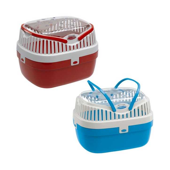 Aladino is a small plastic pet carrier equipped with a practical handle and transparent top lid that can be opened.