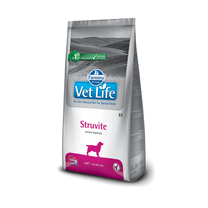 Farmina Vet Life Struvite è un alimento dietetico completo destinato ai cani, indicato per la dissoluzione di calcoli a base di struvite e per la riduzione delle recidive di calcoli di struvite
