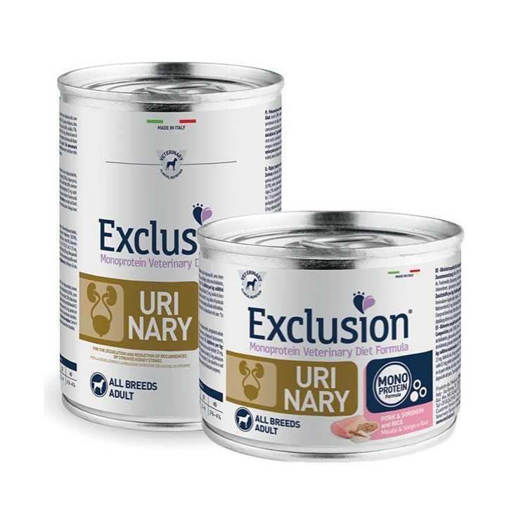 Exclusion Diet Urinary All Breeds è un alimento completo dietetico formulato per la dissoluzione di calcoli a base di struvite e per la riduzione di recidive dei calcoli di struvite.