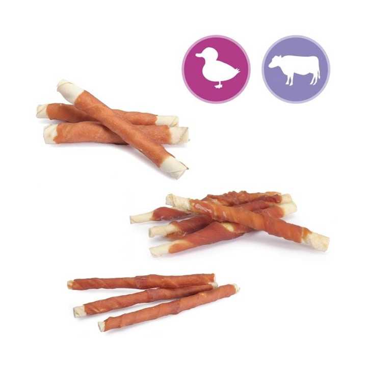Questi ossi arrotolati di pelle bovina con anatra, senza additivi, sono uno sfizioso alimento complementare masticabile per cani. Disponibili in 3 diverse dimensioni.
