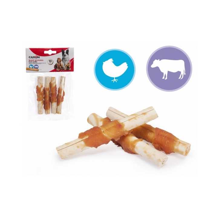 Questi twist con pollo e pelle bovina sono un comodo e stuzzicante alimento masticabile per cani.