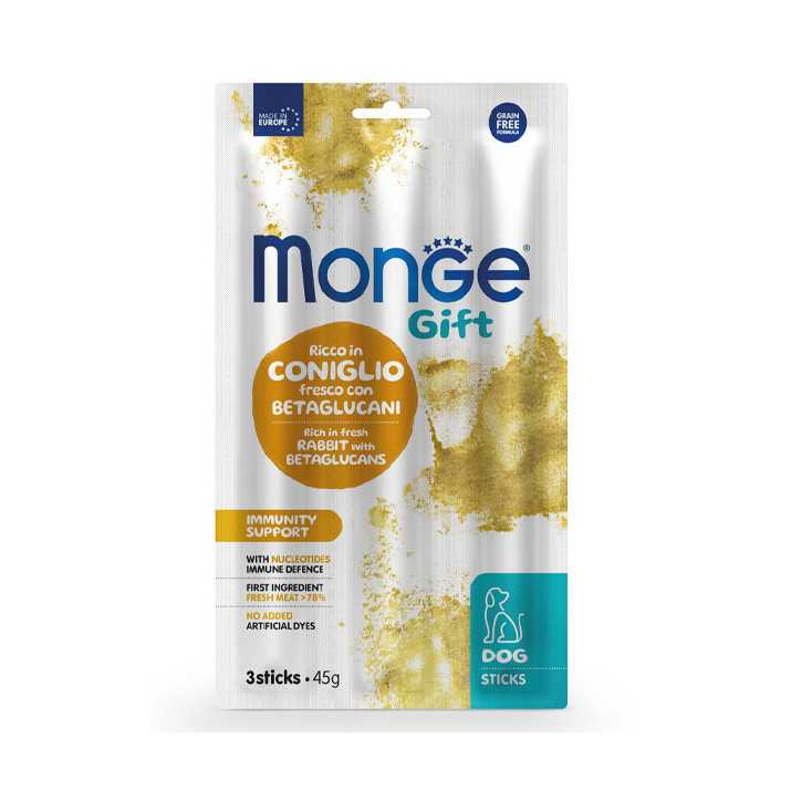 Contrassegno (+3 Euro)MONGE GIFT IMMUNITY SUPPORT DOG RICCO IN CONIGLIO FRESCO CON NUCLEOTIDI E BETAGLUCANI è un alimento complementare per cani adulti. Specificatamente sviluppato per il benessere del tuo cane grazie all’inclusione di betaglucani fibre a supporto delle difese dell’organismo e al ridotto contenuto di grassi* per favorire il mantenimento del peso corporeo ideale. Prodotto formulato senza cereali e con carne fresca preziosa fonte di proteine ad elevata digeribilità e valore biologico. La formulazione è arricchita con vitamine per la vitalità quotidiana. L’inclusione di ingredienti funzionali, come i nucleotidi per rinforzare il sistema immunitario, è frutto della ricerca Made in Italy per supportare la qualità di vita dei nostri cani. Senza coloranti artificiali e zuccheri aggiunti.