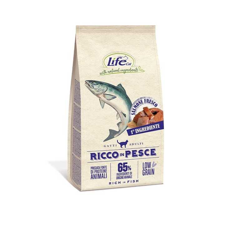 La formula RICCO in PESCE è preparata con alte percentuali di pesce, con salmone fresco primo ingrediente, e pochi cereali, pensata per soddisfare i bisogni di un carnivoro puro come il gatto.