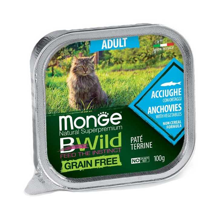Contrassegno (+3 Euro)Monge Natural Super Premium Bwild Grain Free Formula Gatto Adulto Acciughe con ortaggi (fagiolini e carote) è un alimento completo e bilanciato per gatti adulti.