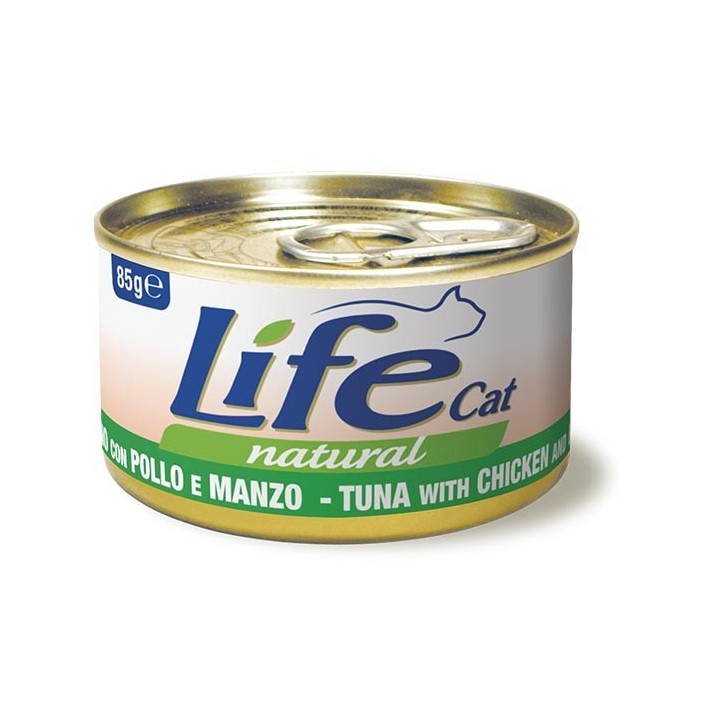 100% naturale. Trancetti di tonno di prima scelta presenti in grande quantità e guarniti con veri filetti di manzo e petto di pollo. Il tutto cotto al vapore e conservato in brodo di cottura. Il tonno e il manzo rendono l’alimento ricco di proteine nobili, di preziosi acidi grassi omega 3 e povero di carboidrati, nel rispetto delle esigenze nutrizionali del gatto.