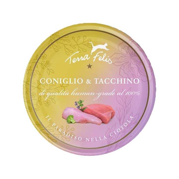 Ingredienti: Carne di coniglio (53% ), fegato di tacchino (21% ), muscolo di tacchino (8% ), pelle di tacchino (8% ), broccolo (4% ), pomodoro in polvere, olio di colza, alga marina*, erba gatta*, minerali