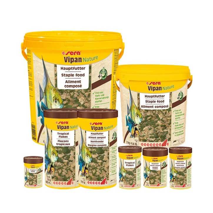 Contrassegno (+3 Euro)Sera Vipan Nature è il mangime completo in scaglie galleggianti senza coloranti e conservanti per tutti i pesci ornamentali che mangiano in superficie.